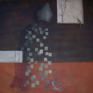 Pintura acrílica sobre banco de madeira e lagarto de tecido